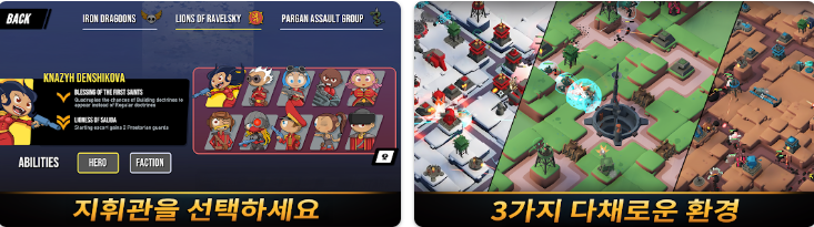 각 진영은 고유한 생물 군계, 타워, 전략을 갖춘 무기를 전장에 가져옵니다. 독특한 플레이 스타일은 방어 건물 구축, 유닛 배치, 전투 제어 방식에 영향을 줍니다. 진영마다 10명의 독특한 영웅이 있으며, 각 영웅은 고유한 강점과 능력을 지니고 있어 항상 새로운 전술을 발견하고 전략을 익힐 수 있습니다.
