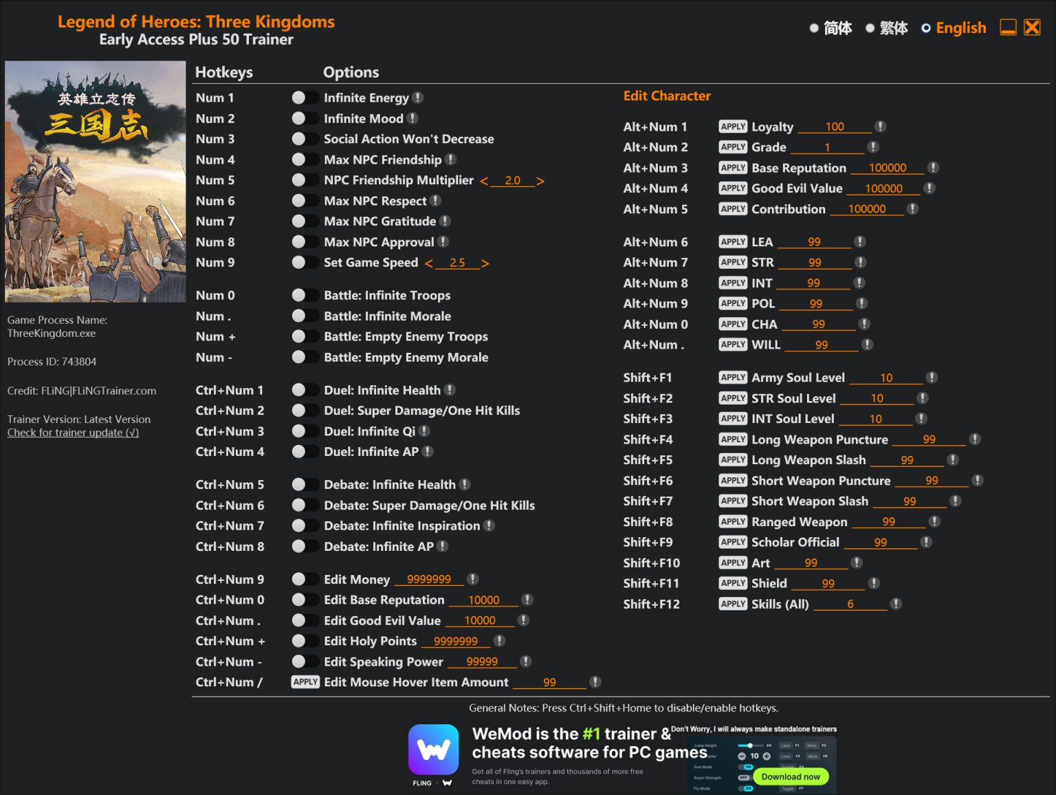 영웅전설: 삼국지 핵,치트/ 트레이너 Early Access+ (Legend of Heroes: Three Kingdoms Trainer)ㅣ무한 에너지ㅣ무한 기분ㅣ사회적 행동 감소 없음ㅣ친밀도 최대치 등 50가지