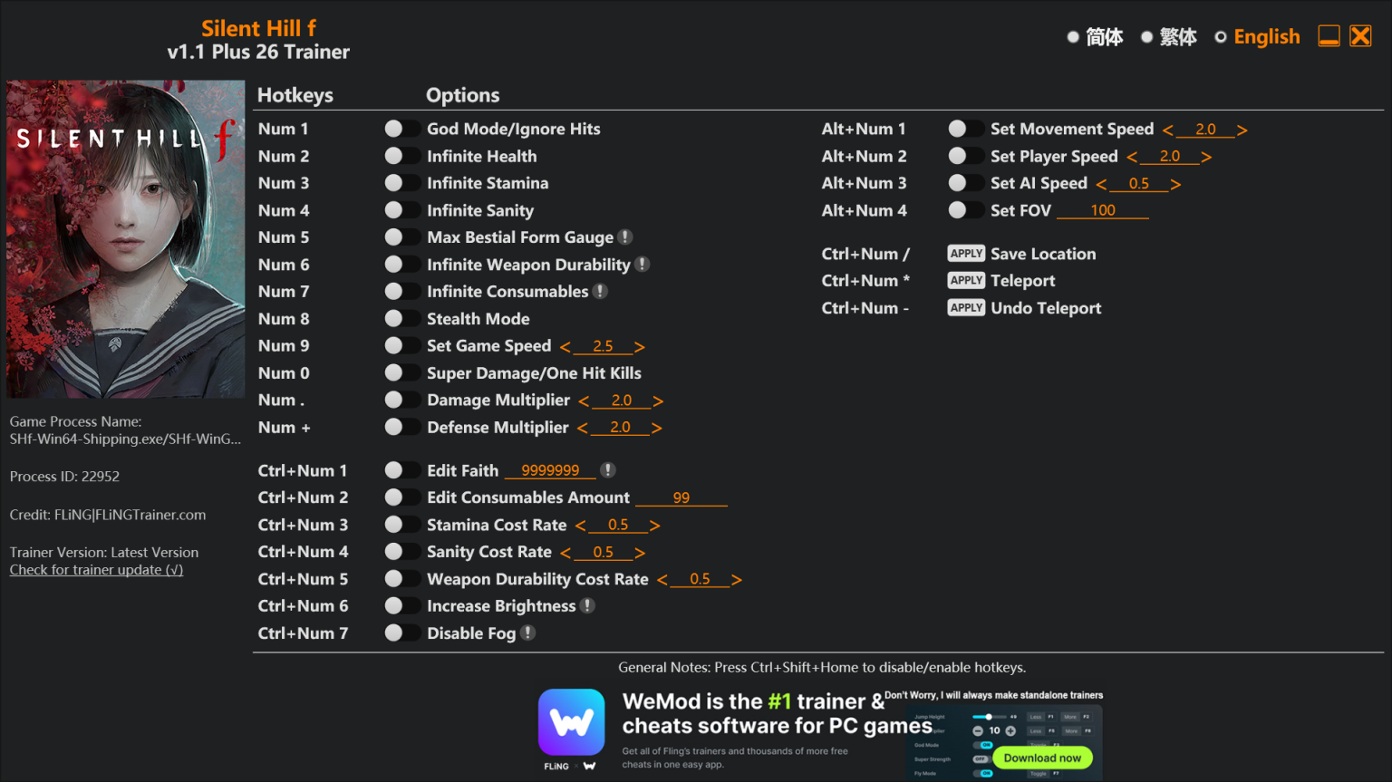 사일런트 힐 F 핵,치트/ 트레이너 v1.1+ (Silent Hill f Trainer)ㅣ무적ㅣ무한 체력ㅣ무한 스태미나ㅣ무한 …잠시만 기다리시면 다운로드 링크가 나옵니다.
