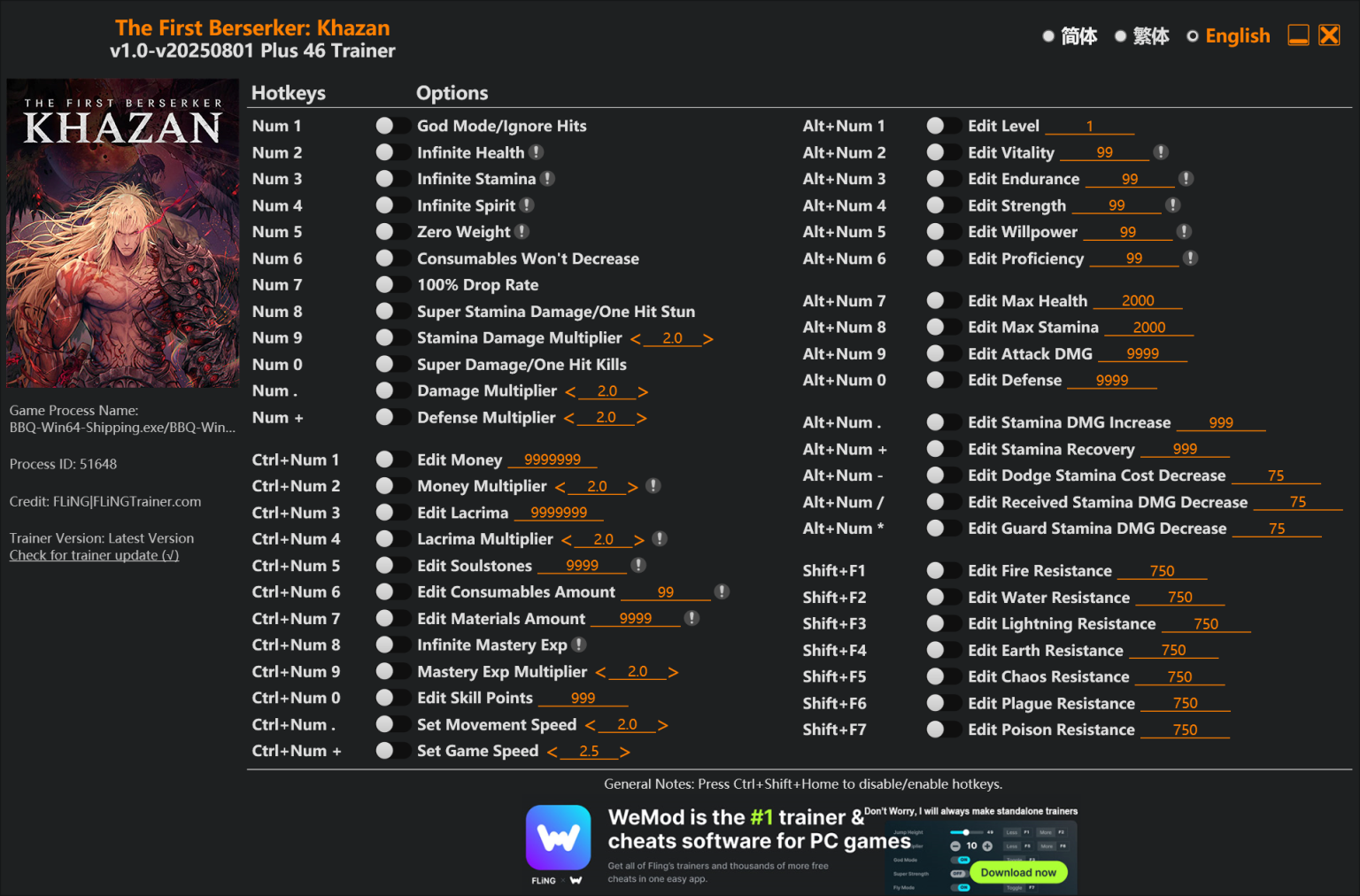 퍼스트 버서커: 카잔 핵,치트/ 트레이너 v1.0-v20250801+ (The First Berserker: Khazan Trainer)ㅣ무적 모드ㅣ무한 HPㅣ무한 스태미나ㅣ무한 정신력 등 46가지