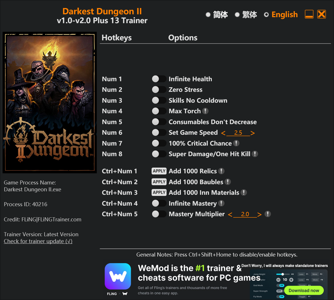 다키스트 던전 2 핵,치트/ 트레이너 v1.0-v2.0+ (Darkest Dungeon II Trainer)ㅣ무한 체력ㅣ스트레스 없음ㅣ스킬 쿨타임 없음ㅣ횃불 최대치 등 13가지