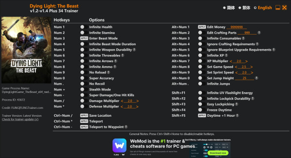 다잉라이트 더 비스트 핵,치트/ 트레이너 v1.2-v1.4+ (Dying Light: The Beast Trainer)ㅣ무한 체력ㅣ무한 스태미너ㅣ야수 모드 진입ㅣ무한 야수모드ㅣ무한 무기 내구성 등 33가지