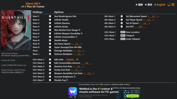 사일런트 힐 F 핵,치트/ 트레이너 v1.1+ (Silent Hill f Trainer)ㅣ무적ㅣ무한 체력ㅣ무한 스태미나ㅣ무한 정신력 등 26가지